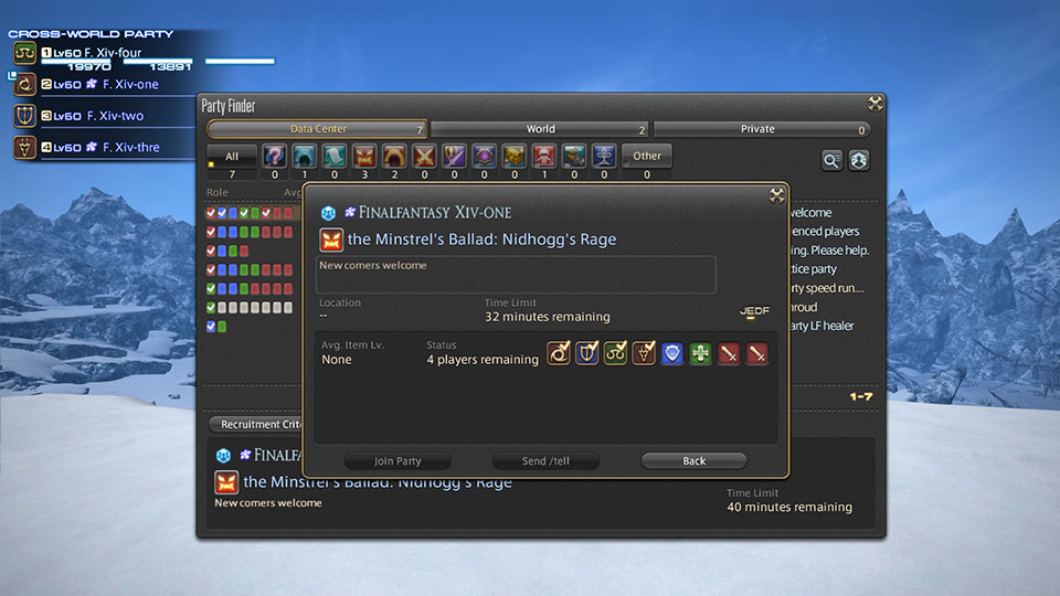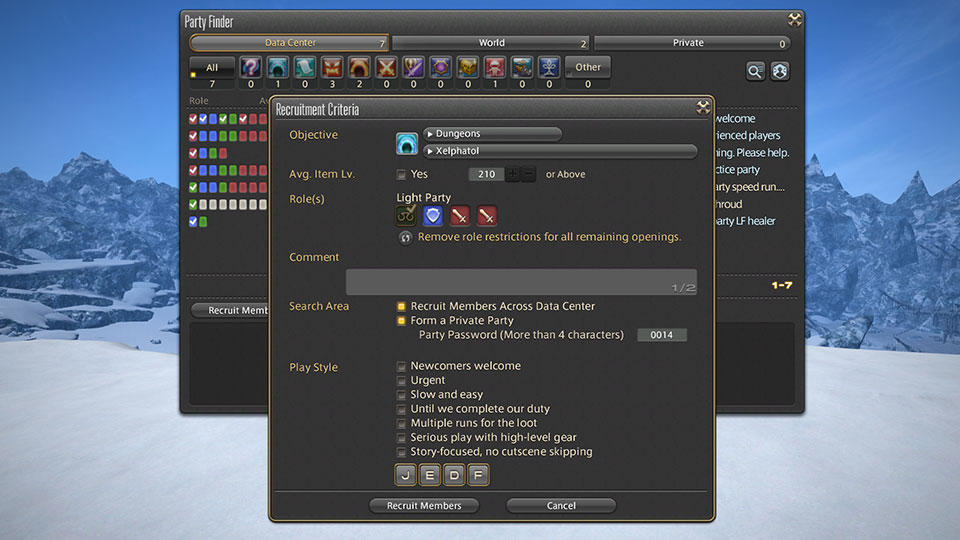 The party finder is no longer just for your World. Starting in patch 3.5, players can use the party finder to recruit fellow adventurers from anywhere within the same data center! If you'd rather limit your recruitment to a select few friends, you can also use a party password. Even when it feels like they're a world away, playing with friends has never been easier.