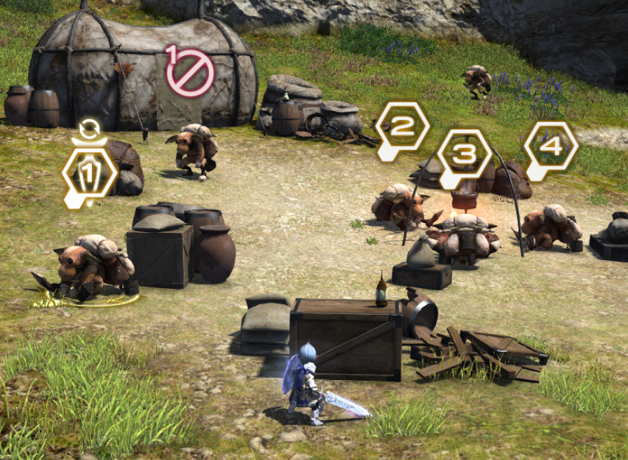 Signs can be placed above players and enemies for party and alliance members to see. They have a variety of uses, such as indicating the order in which enemies must be defeated.