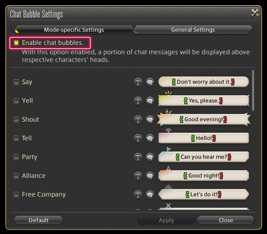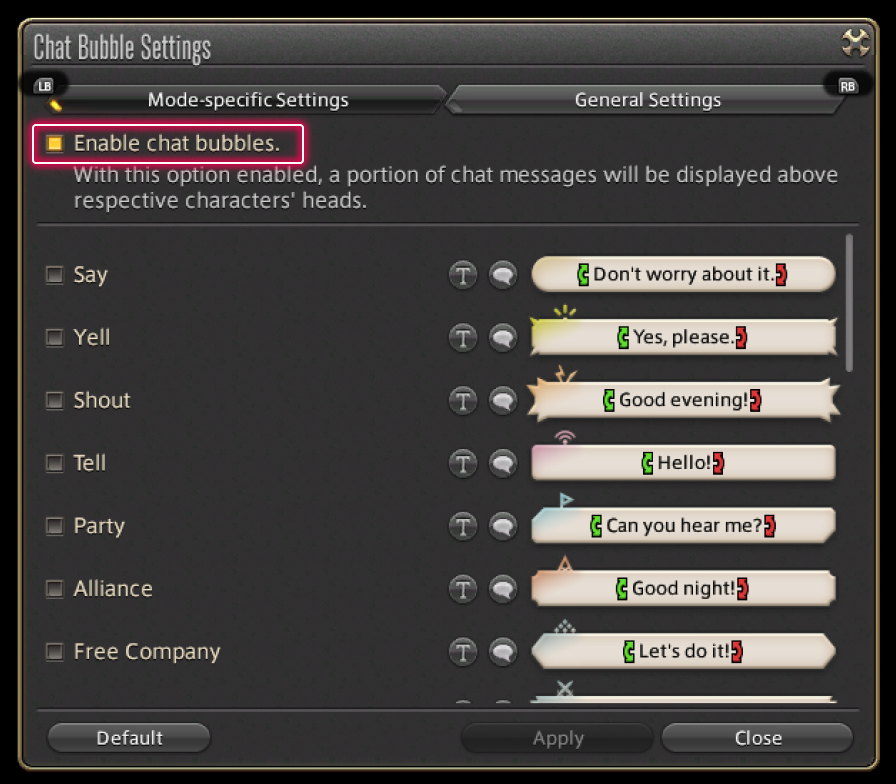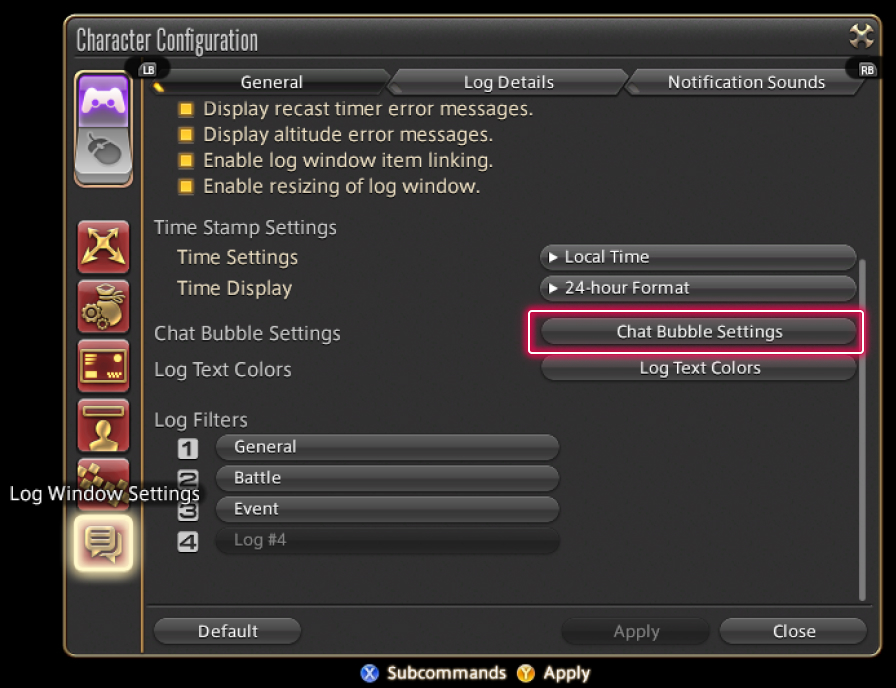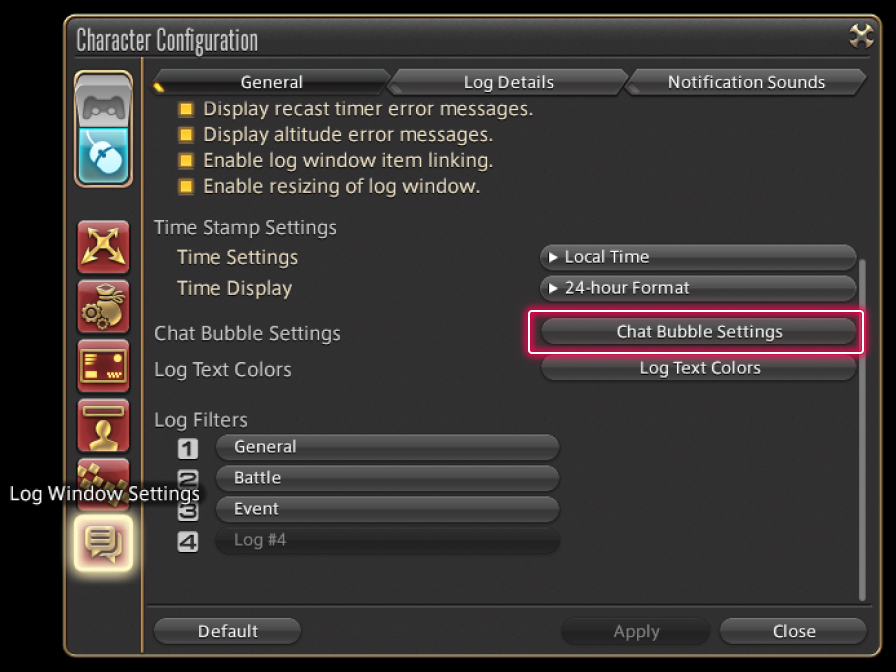 The chat bubble feature displays certain messages above respective characters' heads in-game. To enable the feature, select System from the main menu and select Character Configuration, then select the Log Window Settings tab from the column on the left. Under General, select Chat Bubble Settings and check the "Enable chat bubbles" box.