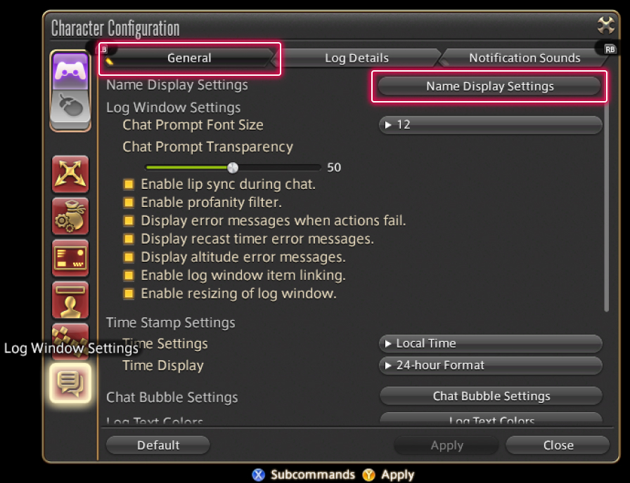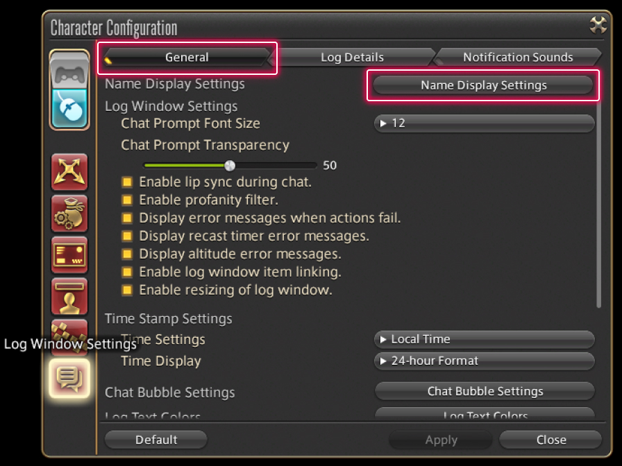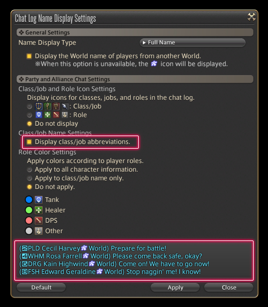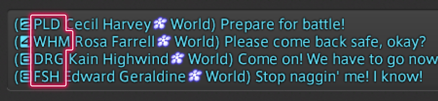 Abbreviated class and job names can be enabled in the chat log for party or alliance members. From the main menu, select System and open the Character Configuration menu, then select the Log Window Settings tab from the column on the left. Under General, select Name Display Settings and check the "Display class/job abbreviations" box.