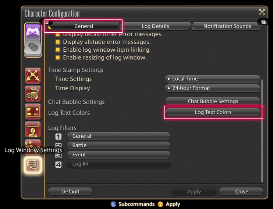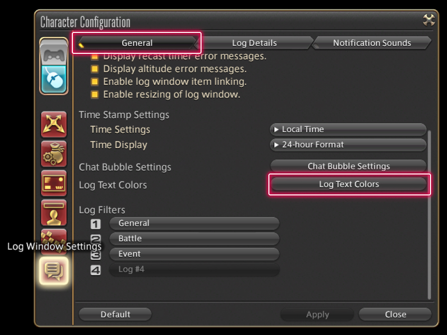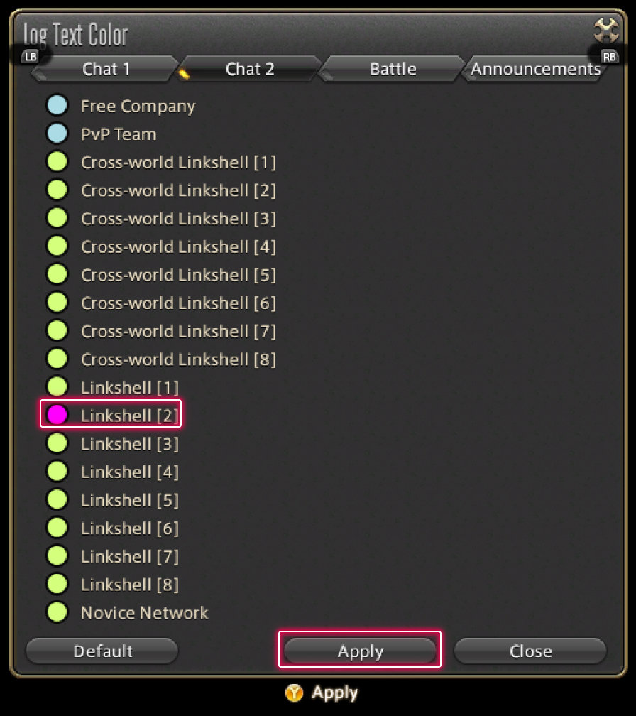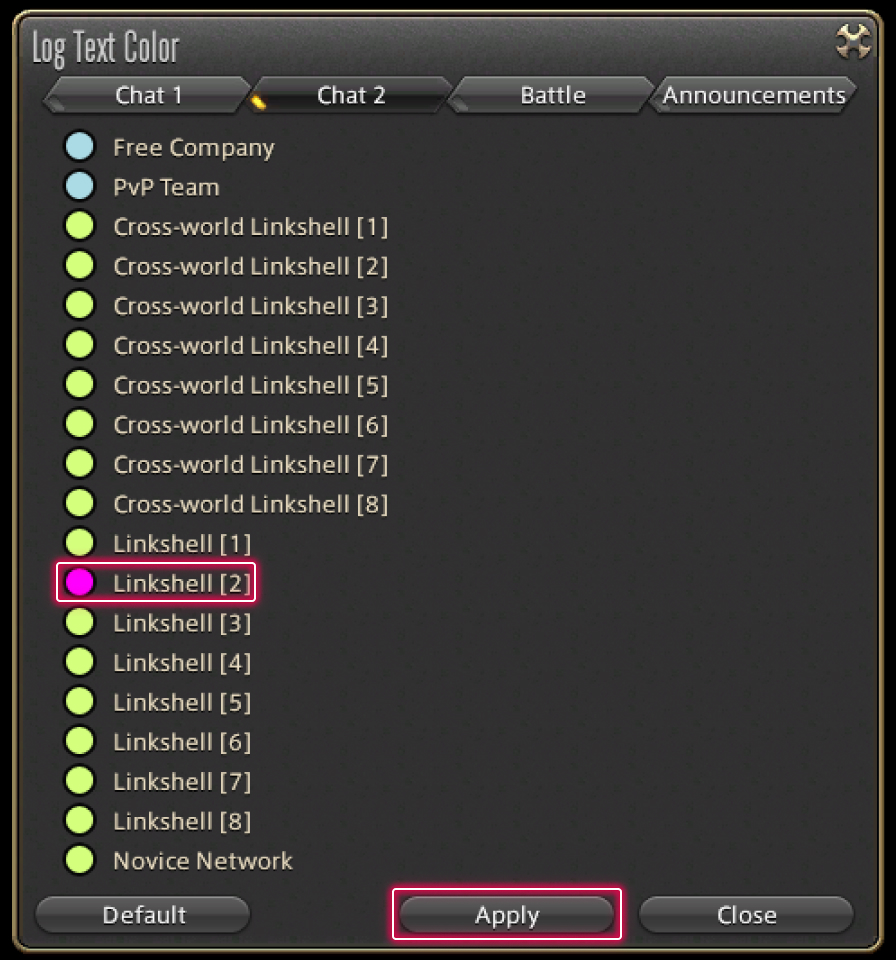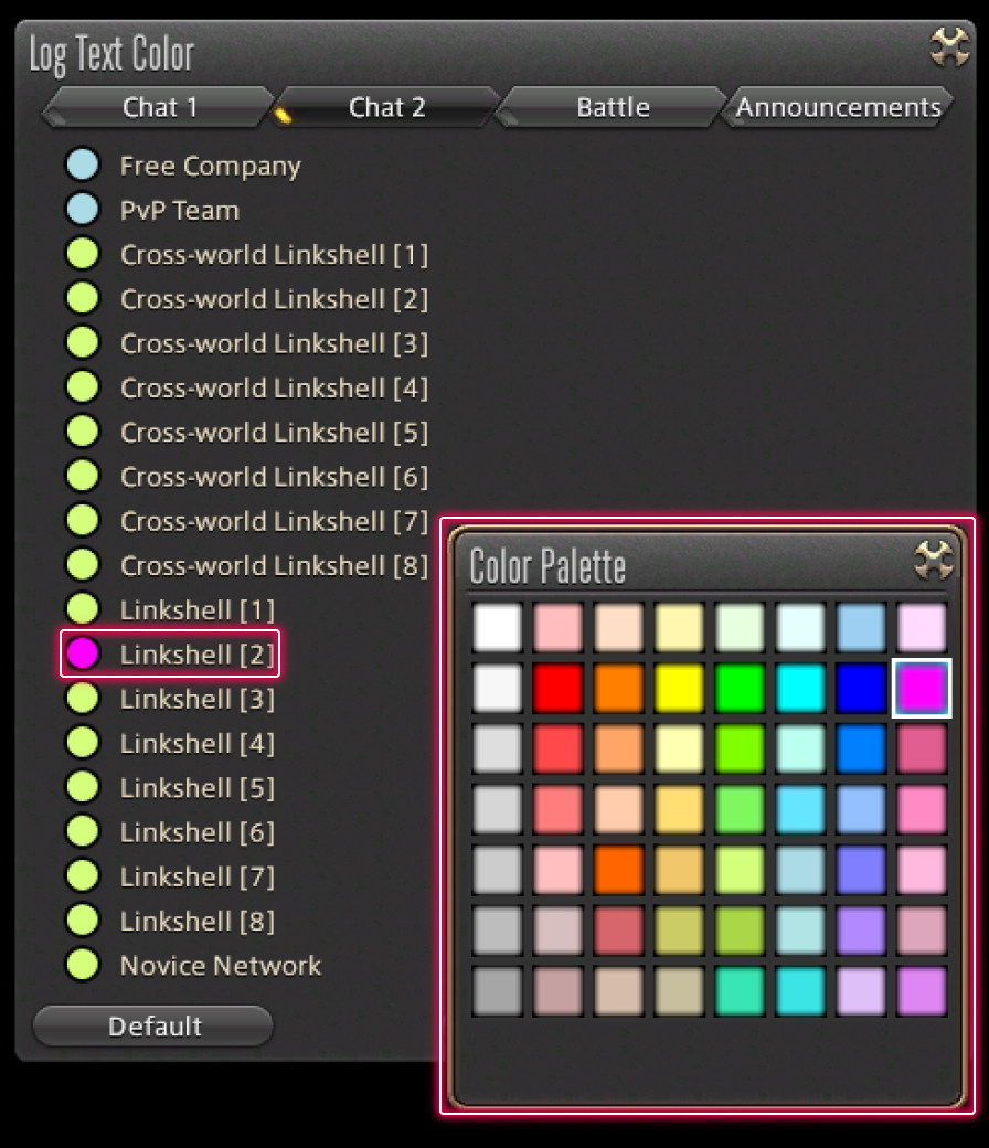 Since all linkshells use the same text color by default, changing the color used by each linkshell makes it easier to differentiate log window messages.