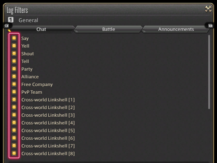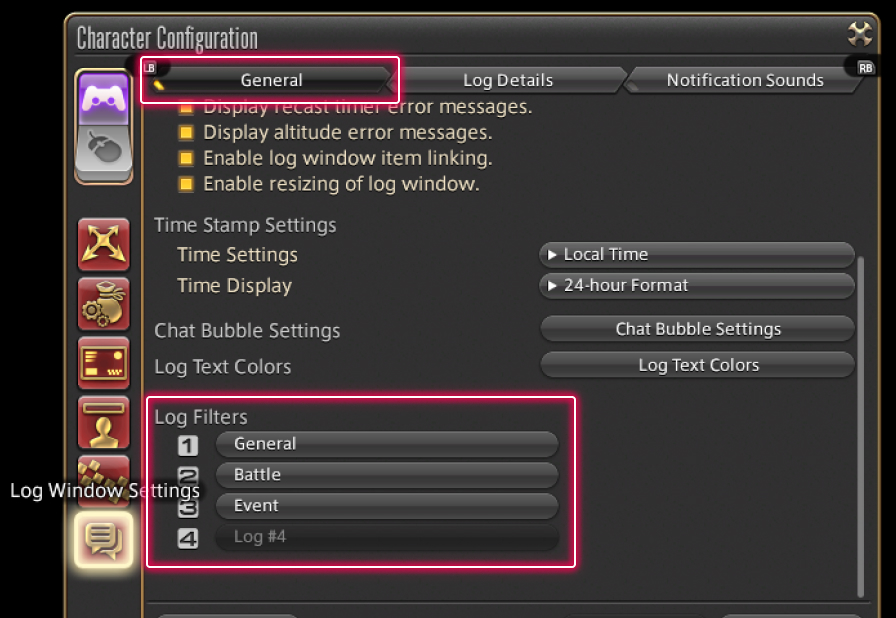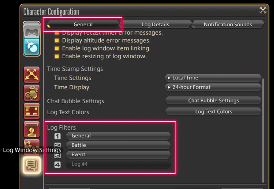 To avoid that happening, you can filter out certain types of messages via Log Filters under the General tab of Log Window Settings in the Character Configuration menu. Select the tab you wish to edit and uncheck the box for any category to hide related messages.