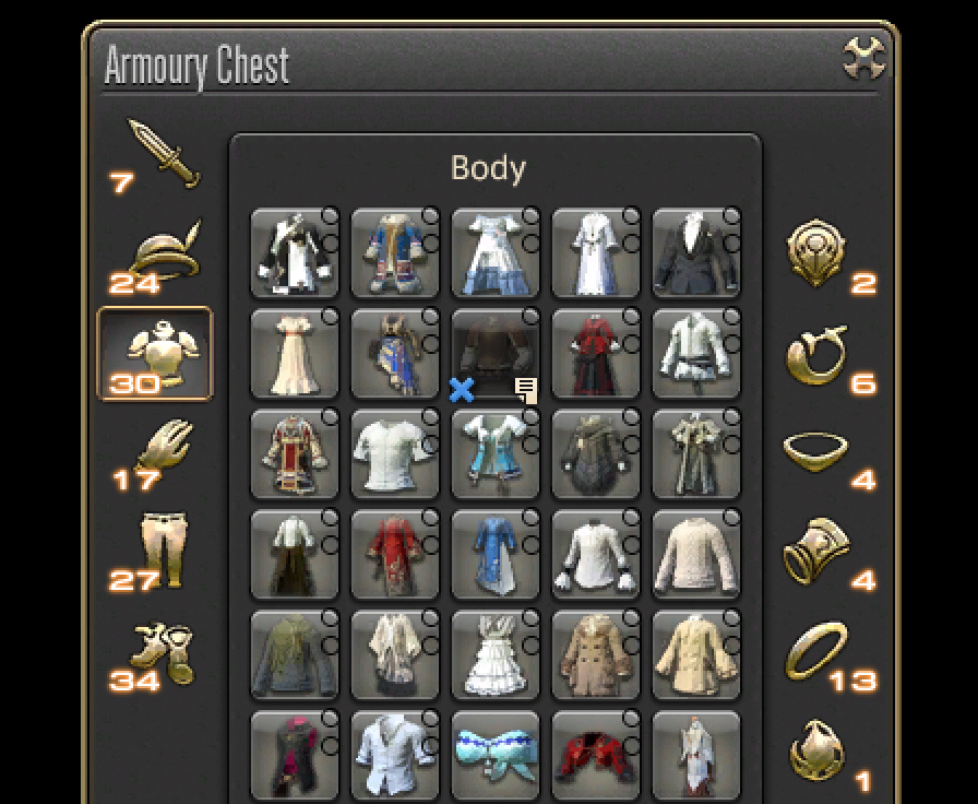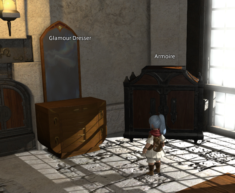 The armoire and glamour dresser can ease this problem. Certain items such as seasonal event costumes can be placed in the armoire, with no upper limit on the number of items that can be stored. For items that cannot be kept in the armoire, there is the glamour dresser.