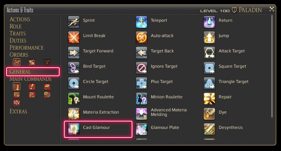 To cast a glamour, use Cast Glamour from Actions & Traits or right-click an item to open its subcommands, then select Cast Glamour. Alternatively, you can access a glamour dresser in an inn room.