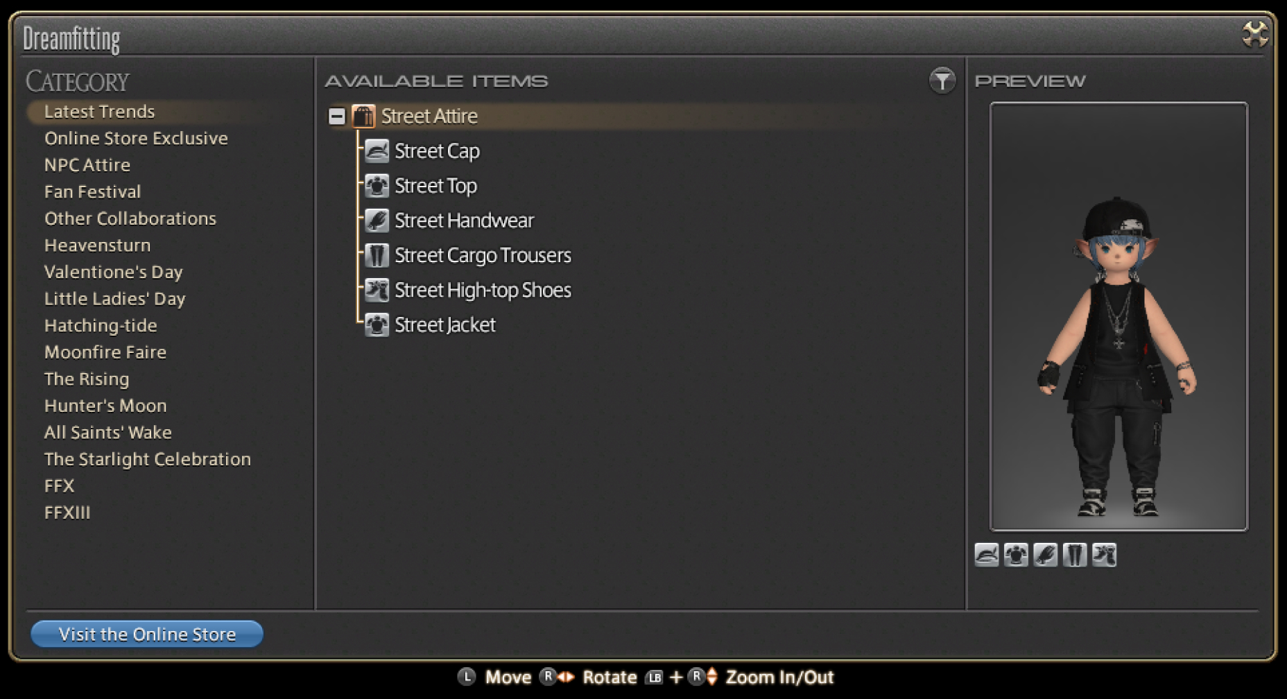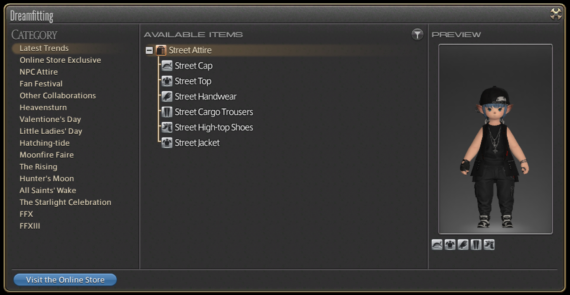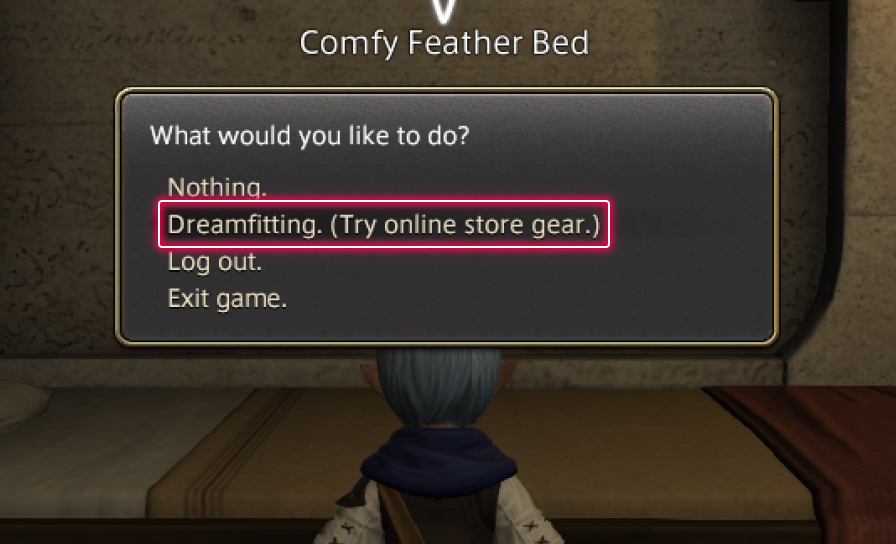 Dreamfitting is an in-game feature that allows your character to try on individual items and set outfits from the FINAL FANTASY XIV Online Store.