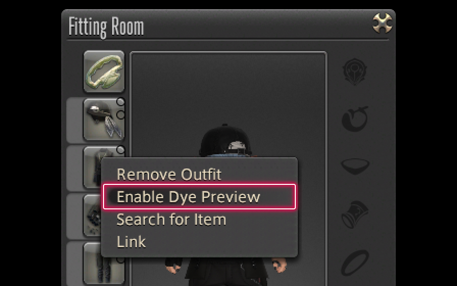 ※You may preview dye options by selecting "Try On" then "Enable Dye Preview" from the subcommand menu.