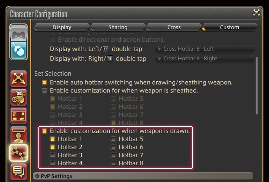 From the same menu, check the box labeled "Enable customization for when weapon is drawn." and then select cross hotbars you wish to include in the set used when your weapon is drawn.