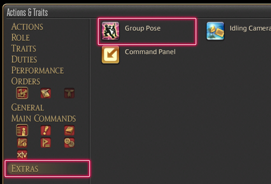 To activate Group Pose, open the Actions & Traits menu under Character in the main menu and select Group Pose from the Extras tab.