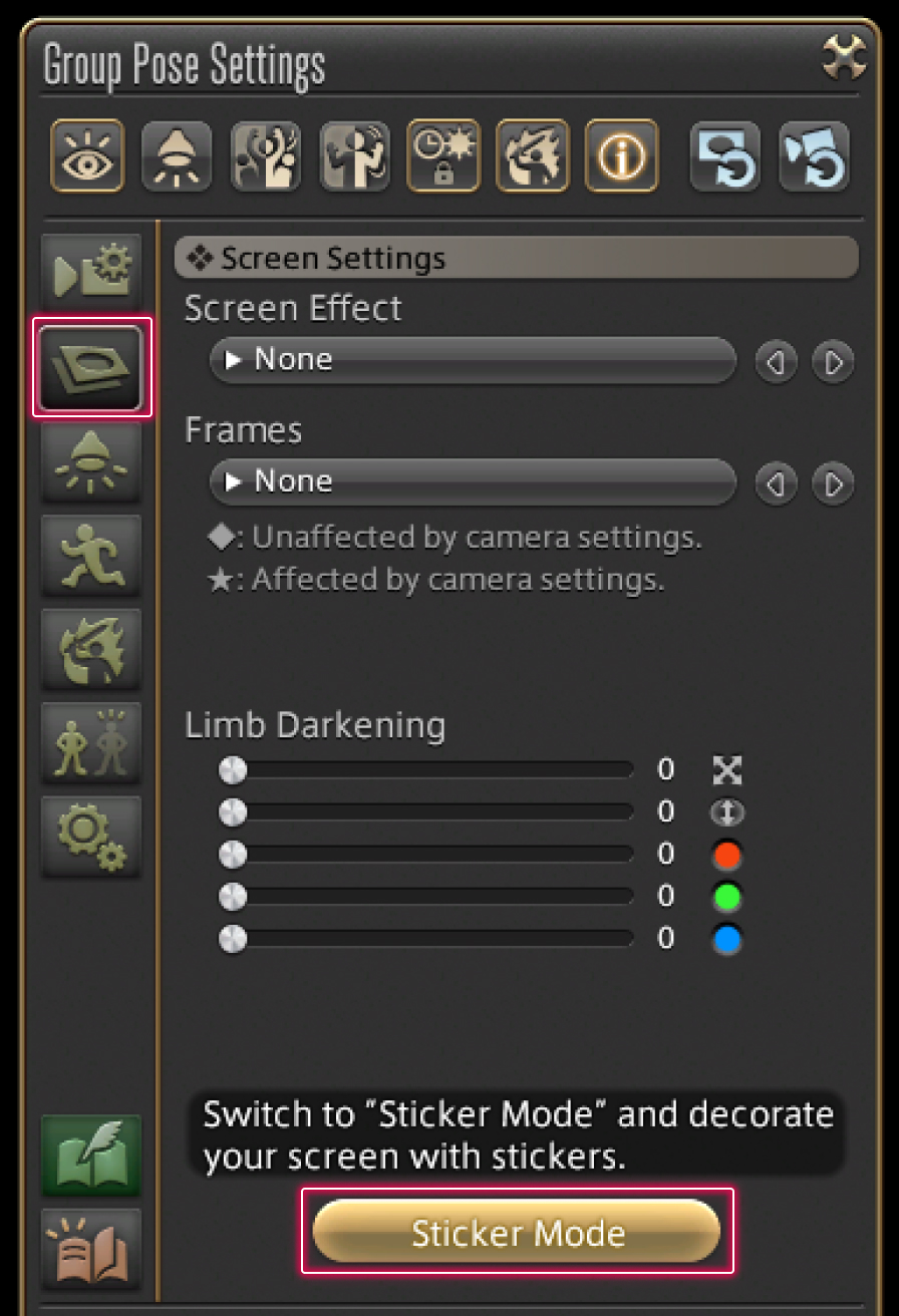 To activate Sticker Mode, press the Sticker Mode button in the Effect/Frame Settings.